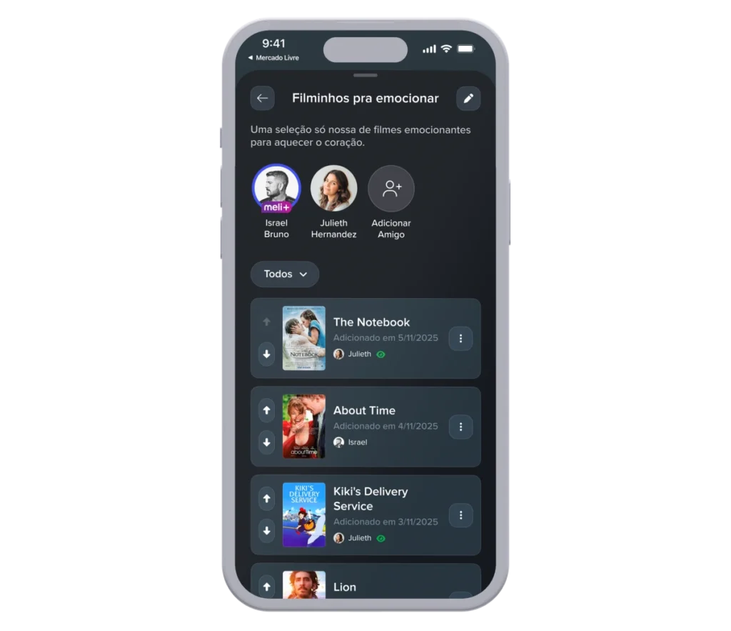 Facilita salvar recomendações em segundos. O usuário adiciona o título à sua lista pessoal ou de grupo.